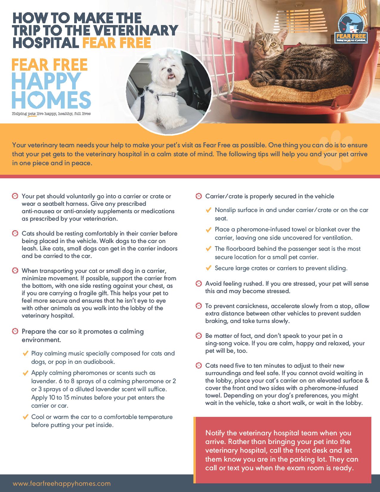 Through the coming months our staff will continue to work on different ways to improve our Fear Free culture and stress-reducing initiatives. Below are two informational handouts from Fear Free that can be very helpful when preparing your pet for his next veterinary visit. (Click or tap the arrow on the left or right of the image below to cycle between them.) You may also visit www.fearfreepets.com to learn more.